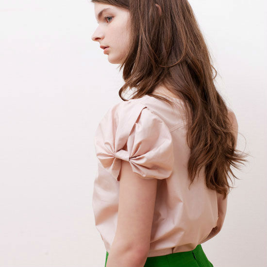 smoky-pink cotton-broad top is cut for a boxy fit. accented with ribbon like a puff sleeve. this summery style will look chic with green shorts.