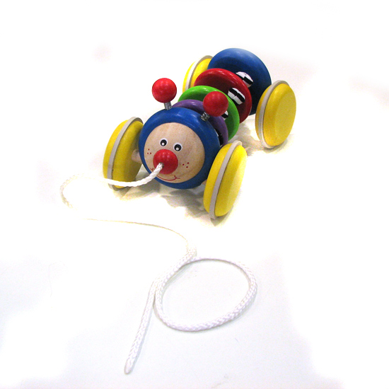 This pull-a-long caterpillar serves as a great companion for your child as they walk around and play. Its body is fully bendable and sways back and forth as it moves along. It is made of various materials such as wood, plastic, fabric and metal springs, and it has a fun and friendly design.