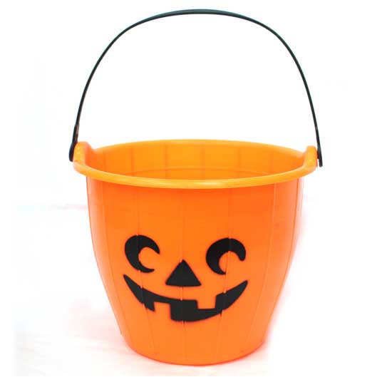 Featured here is an exquisite bucket printed with a pumpkin face. Specially designed for Halloween use, the bucket offers a generous capacity for holding candies or other treats. Securely fitted with a grasp handle, the dainty bucket can be easily carried around by kids for trick-or-treating.