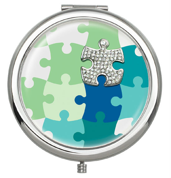 Round shape. Puzzle patterned design in blue & green colors with embossment and white stones.
