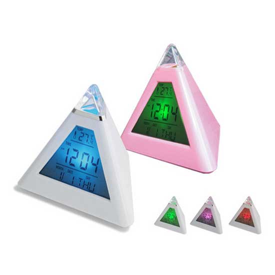 This eye-catching desktop clock features a pyramid-shaped housing with a color-changing LCD display. The functional LCD clock is able to show time, date, days of the week and temperature. The stylish clock makes a great addition to your office desk.