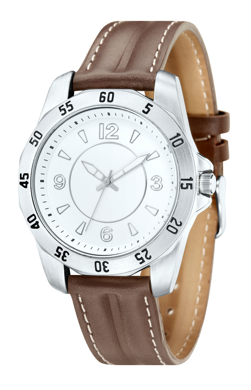 Alloy case, ips plating, structural dial with up index, 3 aTM, turning bezel, genuine leather strap, 3 hands movement