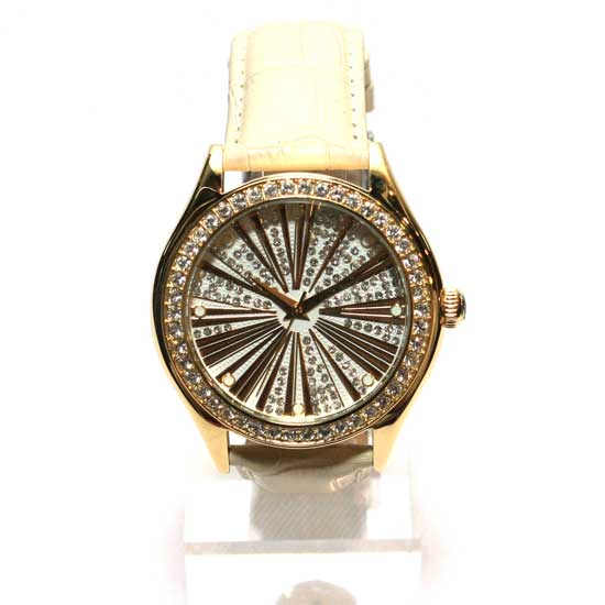 Photographed is a watch accentuated with sparkling stones on the bezel and dial. The watch comes with a genuine leather band for enhanced comfort. The watch lines your wrist with a contemporary touch of elegance.