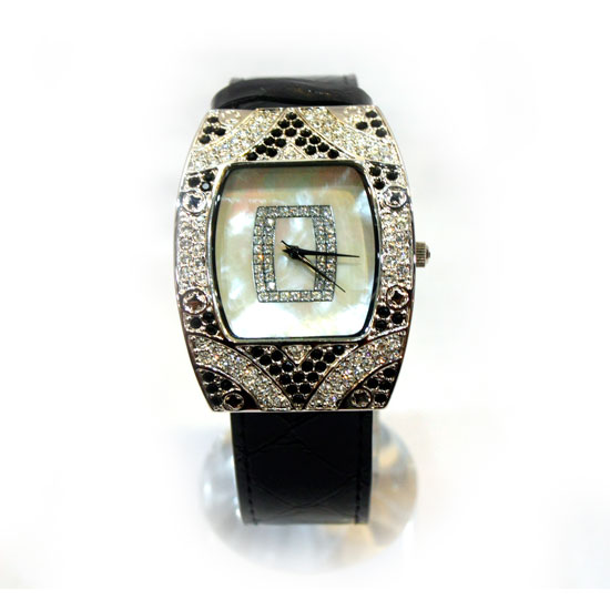 Featured is a quartz analog watch with an elegant and stylish design. The case is decorated with sparkling CZ stones for added style. The MOP dial gives soft and subtle luster.