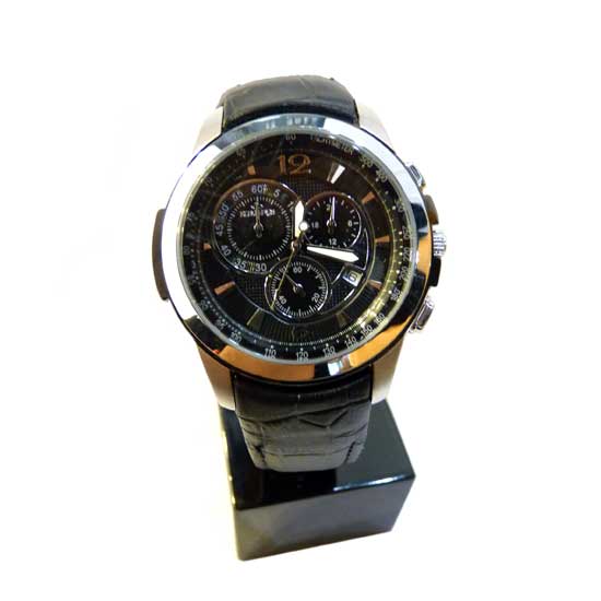 This elegant quartz analog watch features a round stainless steel case and sports black leather bands for enhanced comfort. The black dial is designed with a date display and three sub-dials to offer precise and accurate time and date information. The well designed wristwatch is an excellent choice for gentlemen.