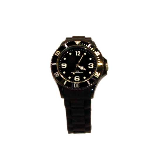 This is a wristwatch with an elegant and trendy design. It features a round case with marks on the bezel. The black dial is crafted with white Arabic numbers and dot markers to indicate the hours.