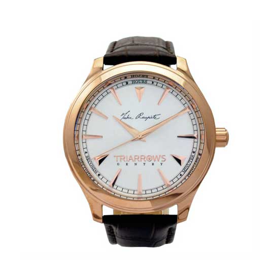This is a quartz analog watch boasting an elegant design. It features a multi-layer dial in white with rose golden markers and hands. The rose golden case in a round shape matches perfectly with the black leather bands for a timeless appearance.