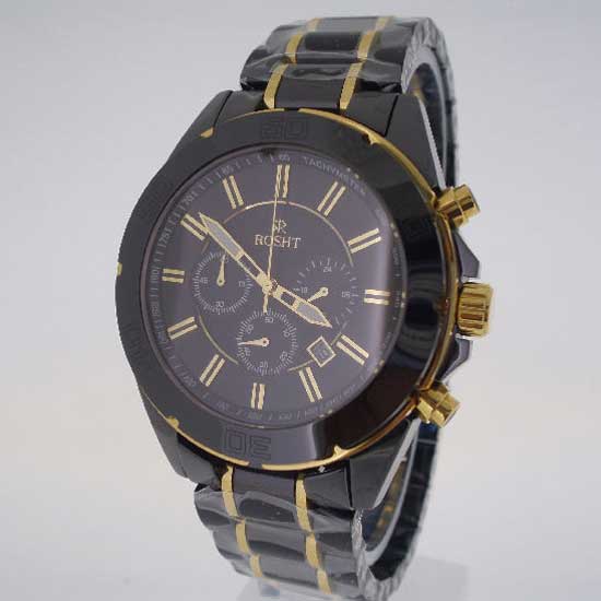This men's quartz chronograph ceramic watch features a stylish design in black and golden. The elegant dial markers and watch hands boast irresistible charm. The rotatable bezel, three sub-dials and date display make it a functional choice for you.