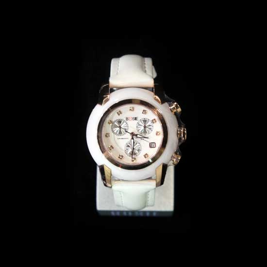 This stylish watch is especially designed for ladies with a white leather-like strap and a golden-tone dial. The white ceramic case with three sub dials highlights this beautiful watch. The precise quartz movement and stainless steel parts finish this stunning timepiece.