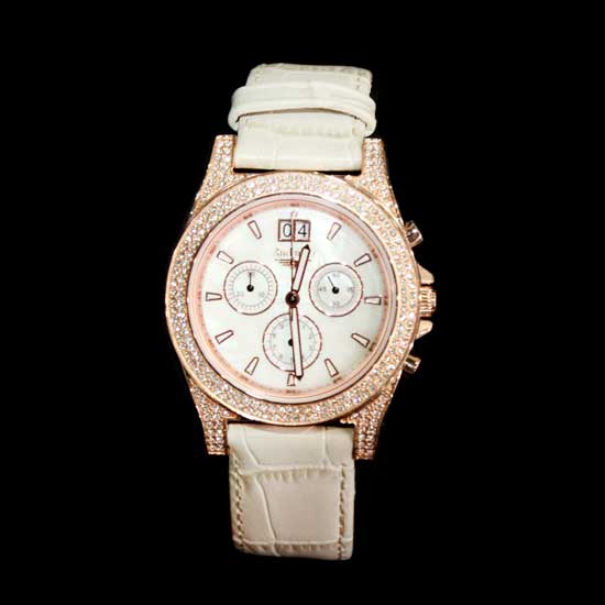This is a quartz watch that features a leather strap for ultimate wearing comfort. The rose-golden watch case is fully accented with sparkling stones for added luxuriousness. The crowns on the right side of the case allow added utility.