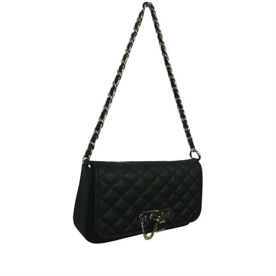 Fashion ladies handbag with quilted flap, chain shoulder strap and with faux lock decor on flap.