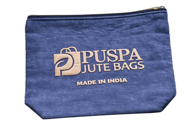Blue denim zipper pouch featuring a premium embroidered “PUSPA JUTE BAGS” logo. Durable, stylish, and perfect for cosmetics, stationery, or travel essentials.