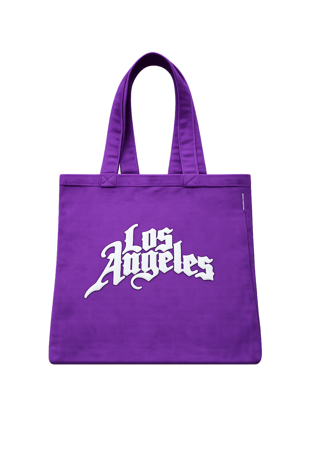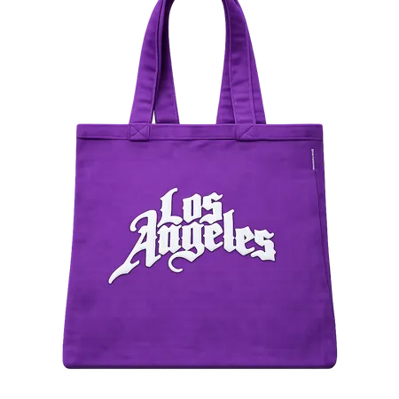 Purple canvas tote bag with sturdy handles, featuring a bold white “Los Angeles” graphic print in Gothic style. Durable, spacious, and ideal for everyday use or shopping.