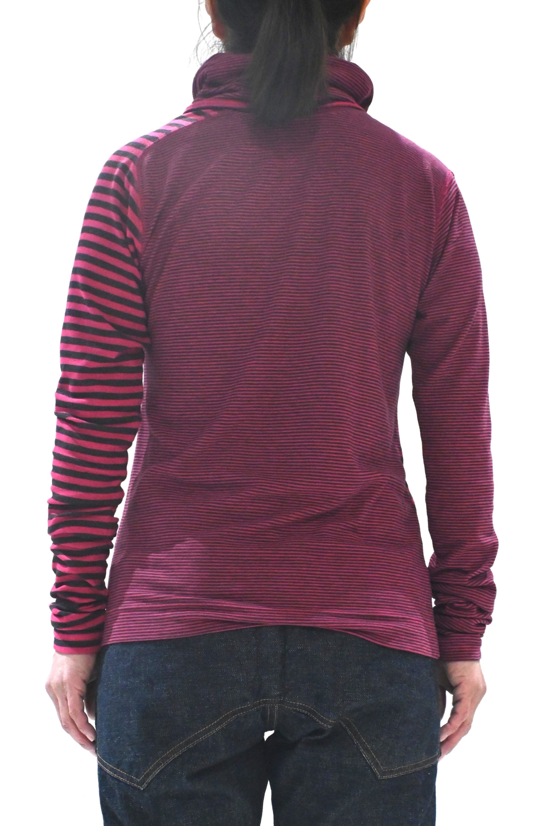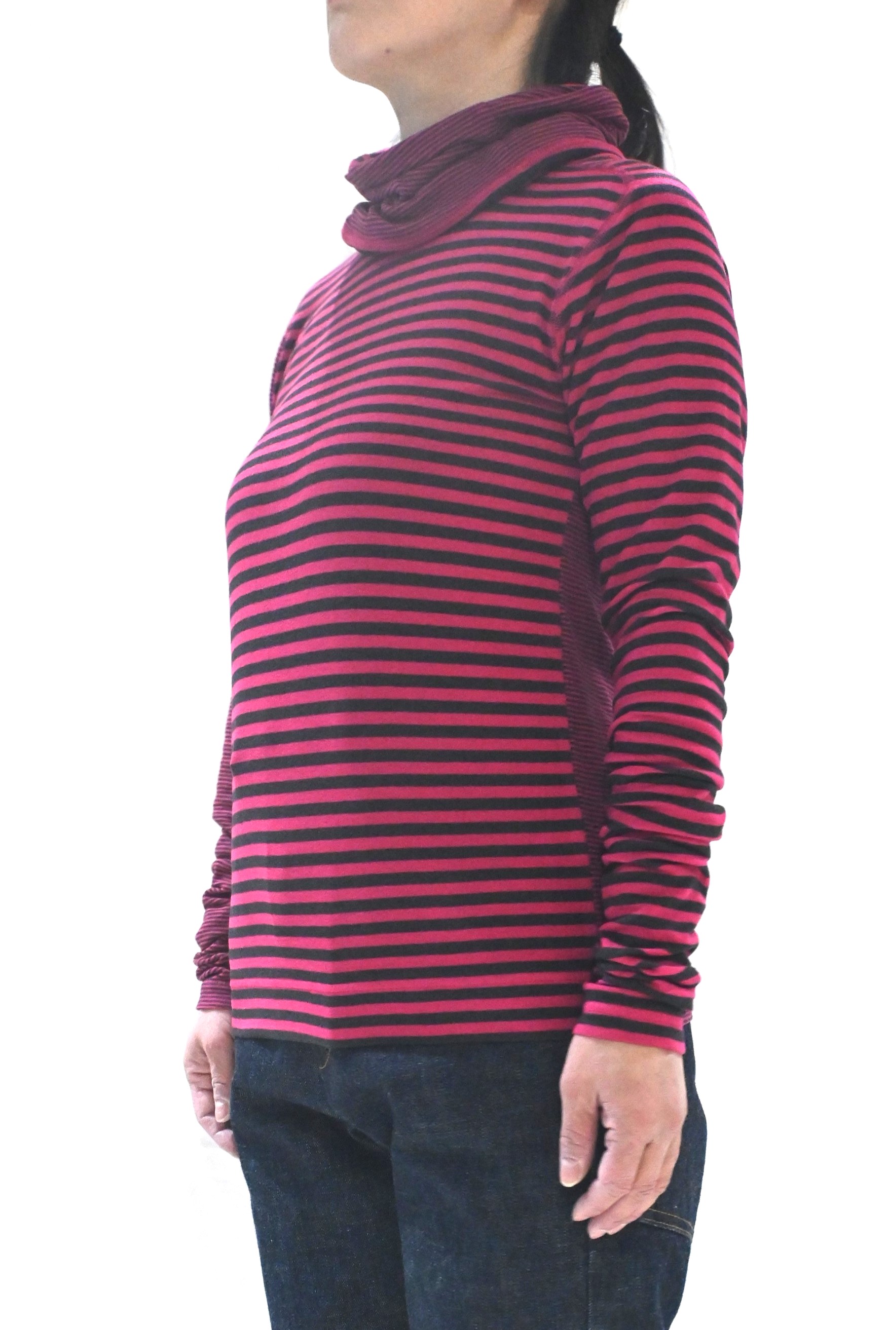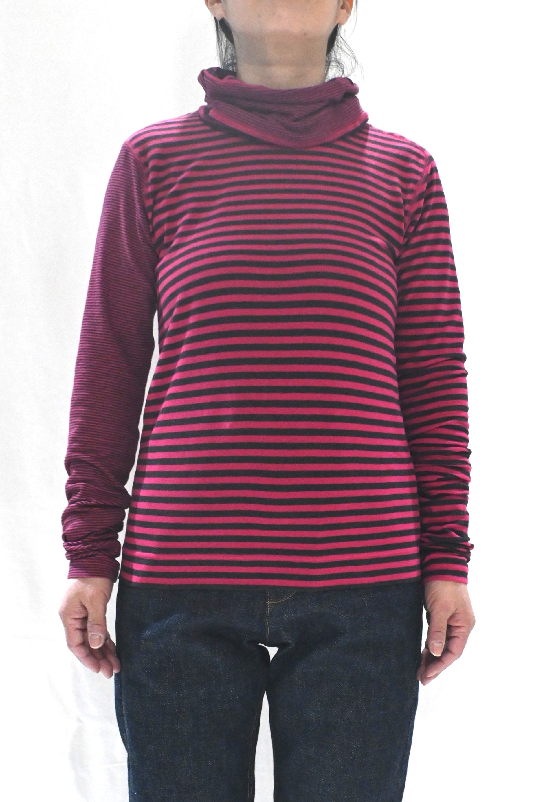 ピッチ違いボーダーでサイドセットインの変形ラグランスリーブ。
