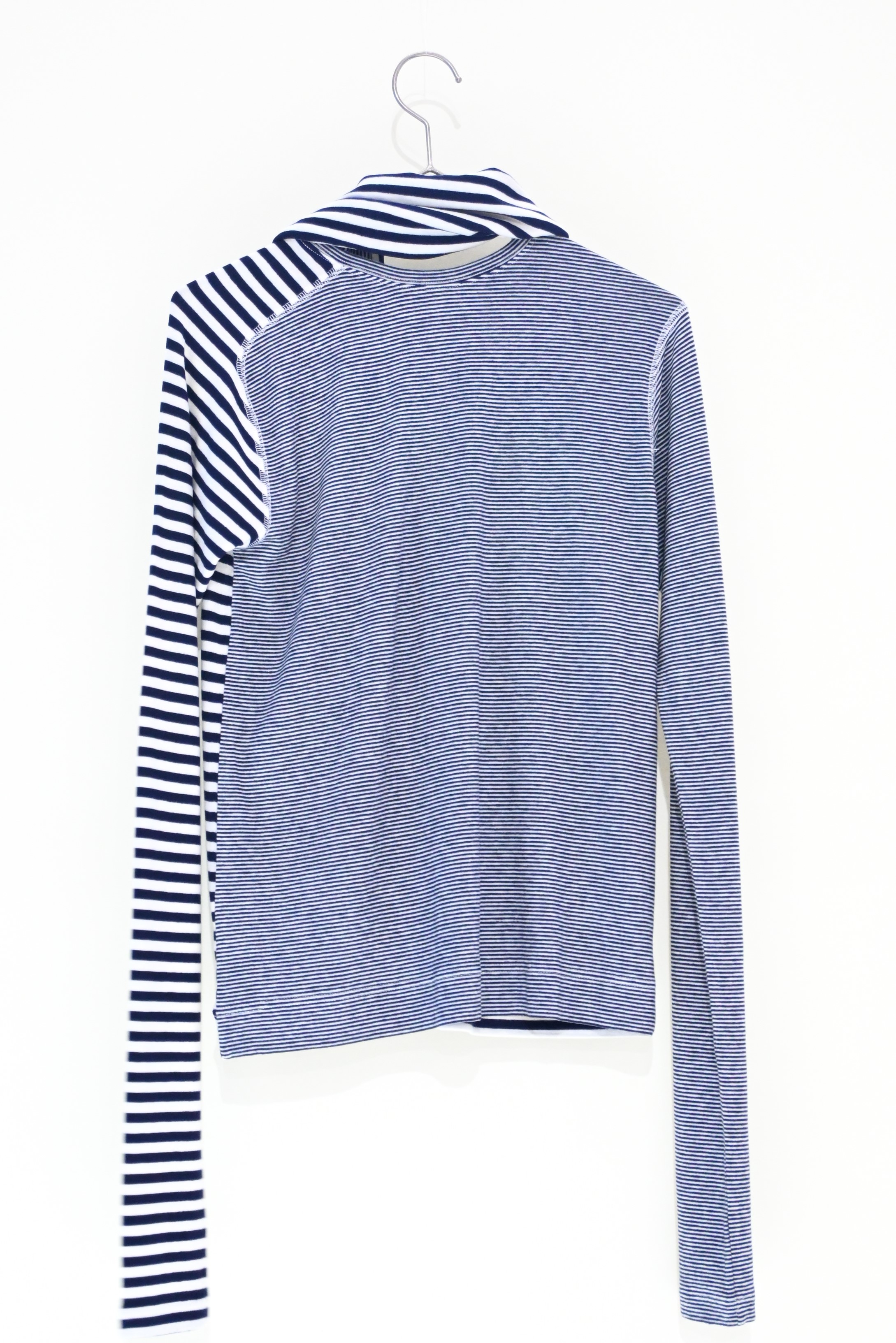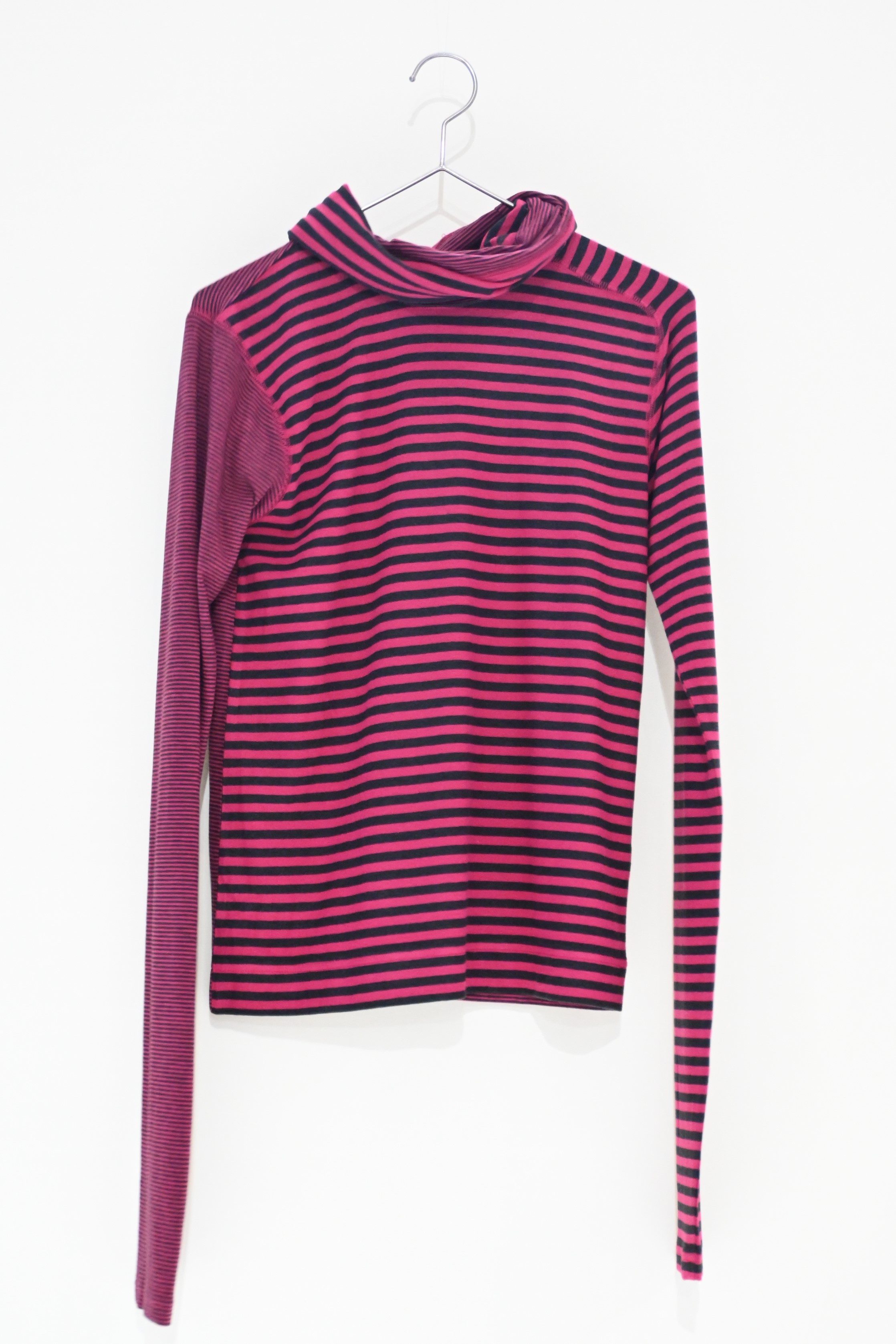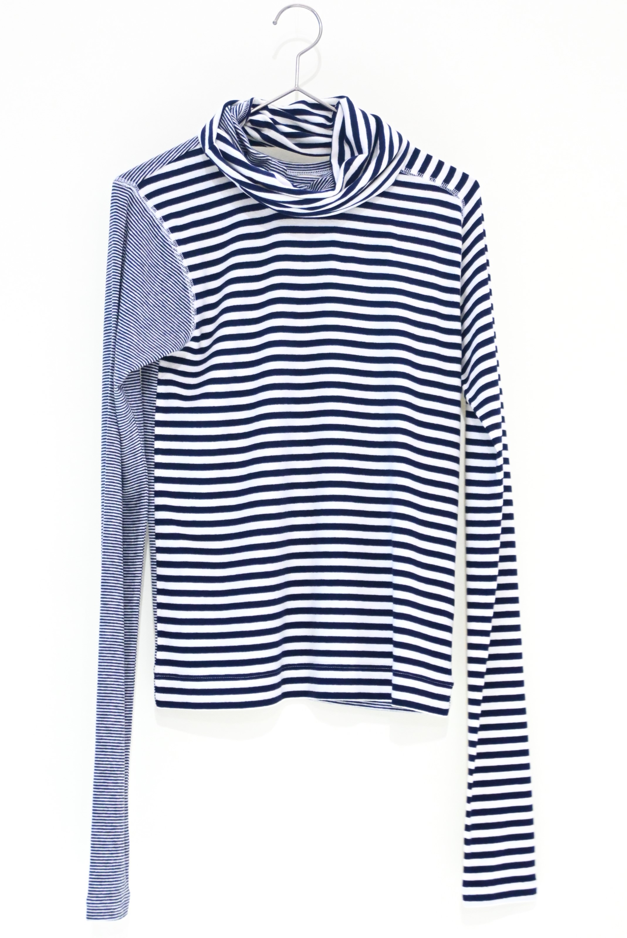 ピッチ違いボーダーでサイドセットインの変形ラグランスリーブ。