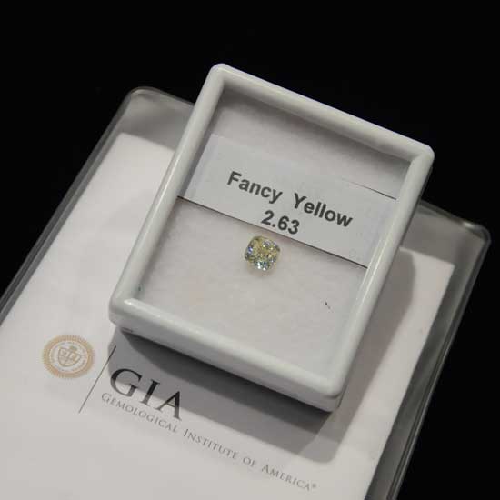 The radiant-cut diamond comes in yellow. This 2.63ct piece reflects incessant glossiness from its multiple facets. The diamond has also been approved with the GIA certification.