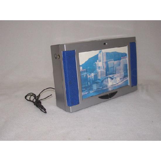 This radio is designed to resemble a television and has switches on the side for volume and channel tuning. It has a stand at the back and has an auxiliary port for connecting to headphones. Users can enjoy their favorite radio station anytime and anywhere with this radio.