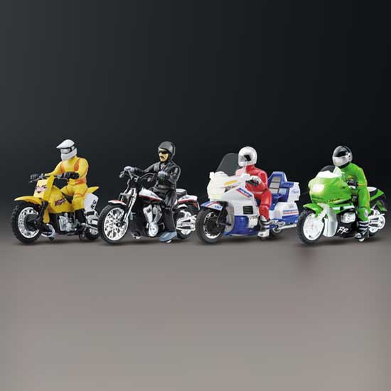 Shown here is a radio-control motorcycle with a racer figure. It comes in different colors for selection. This radio-control motorcycle is highly durable and safe to play with.