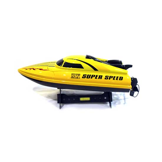This radio-controlled model toy boat features a brilliant yellow toned appearance with capital letters of “BOAT TEAM MX SUPER SPEED”. It comes with a full-function transmitter for easy maneuvering. This cool R/O toy boat is sure to bring kids hours of fun.