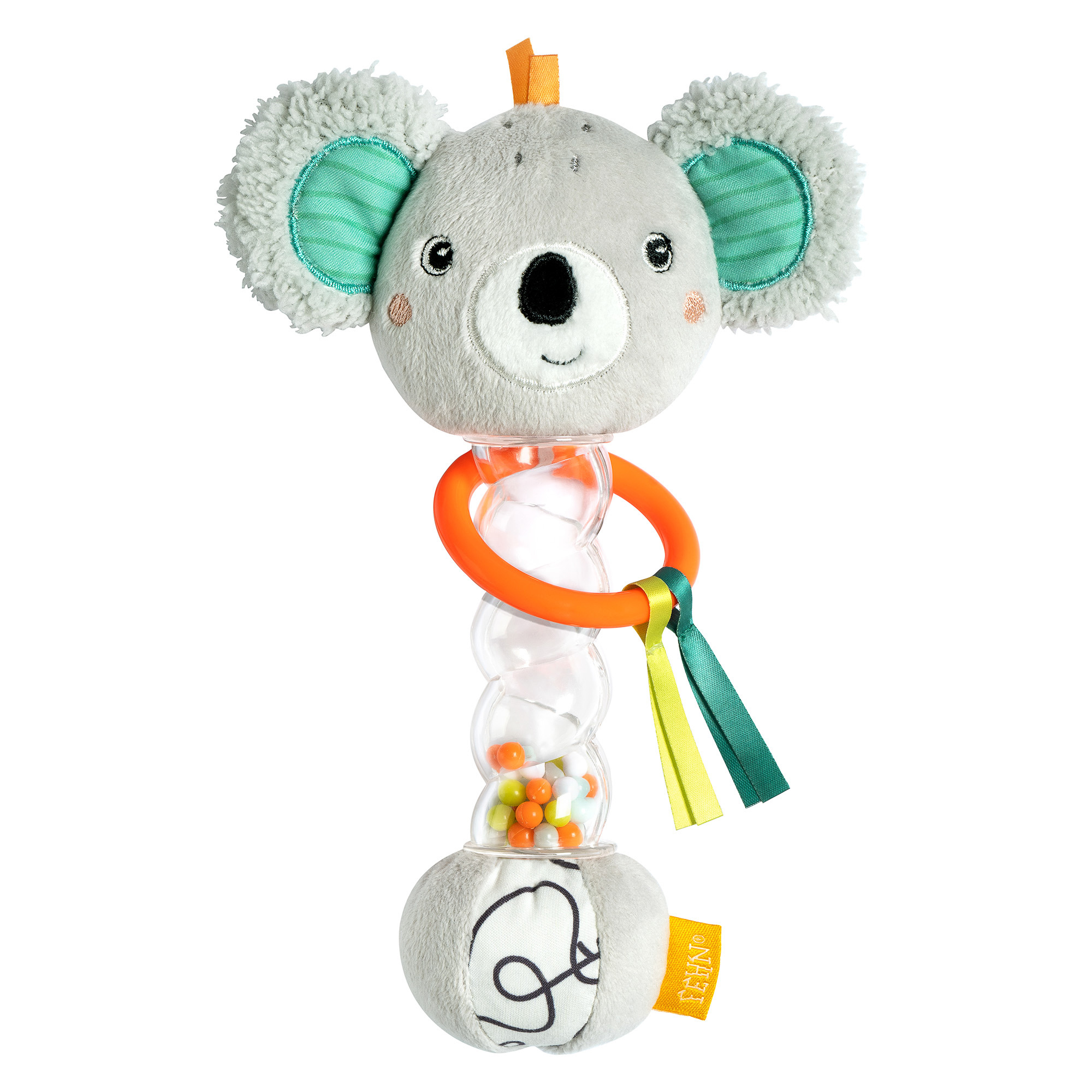 The little rainmaker koala from the DoBabyDoo collection is an exciting companion for babies: colourful beads that slowly trickle along in their rattle stick provide a special sound magic and invite babies to listen closely and perceive. This is a playful way to develop baby's senses and motor skills. Babies love the shape of the koala stick rattle for grasping, touching, shaking and discovering. The cute colourful rattle can be taken anywhere at home or on the go and accompanies little explorers while playing and learning in the pram, baby car seat, cradle or cot. --- Grabber with rattle stick, squeak, crinkly paper & grab ring / for babies and toddlers 3 months up / Top material: velvet, printed fabric, plush / Filling: polyester / ideal as a gift for birth, birthday or baptism for babies and toddlers / tested for safety by independent testing institutes