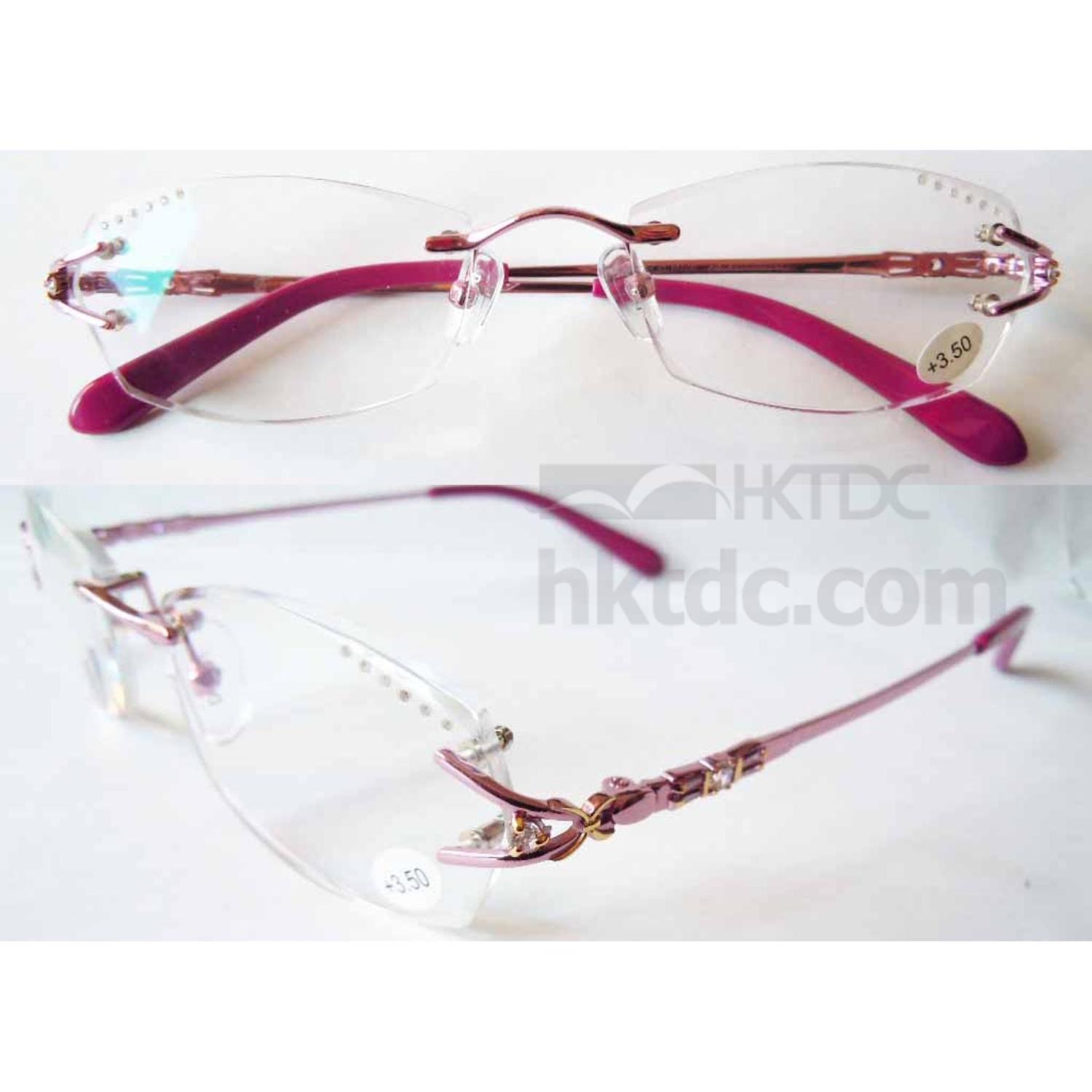 High-end luxury reading glasses made of titanium, stainless metal and acetate plastic material with three-dimensional facet-cutting prescription reading lenses edging, cutting and fitting job decorated with diamonds and multi-tone color plating