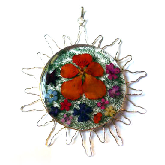 This adorable pendant is made with real flowers and leaves for a beautiful effect. It amazes consumers with the charm of nature. Silver spike patterns surrounding the pendant resemble the shape of the sun.