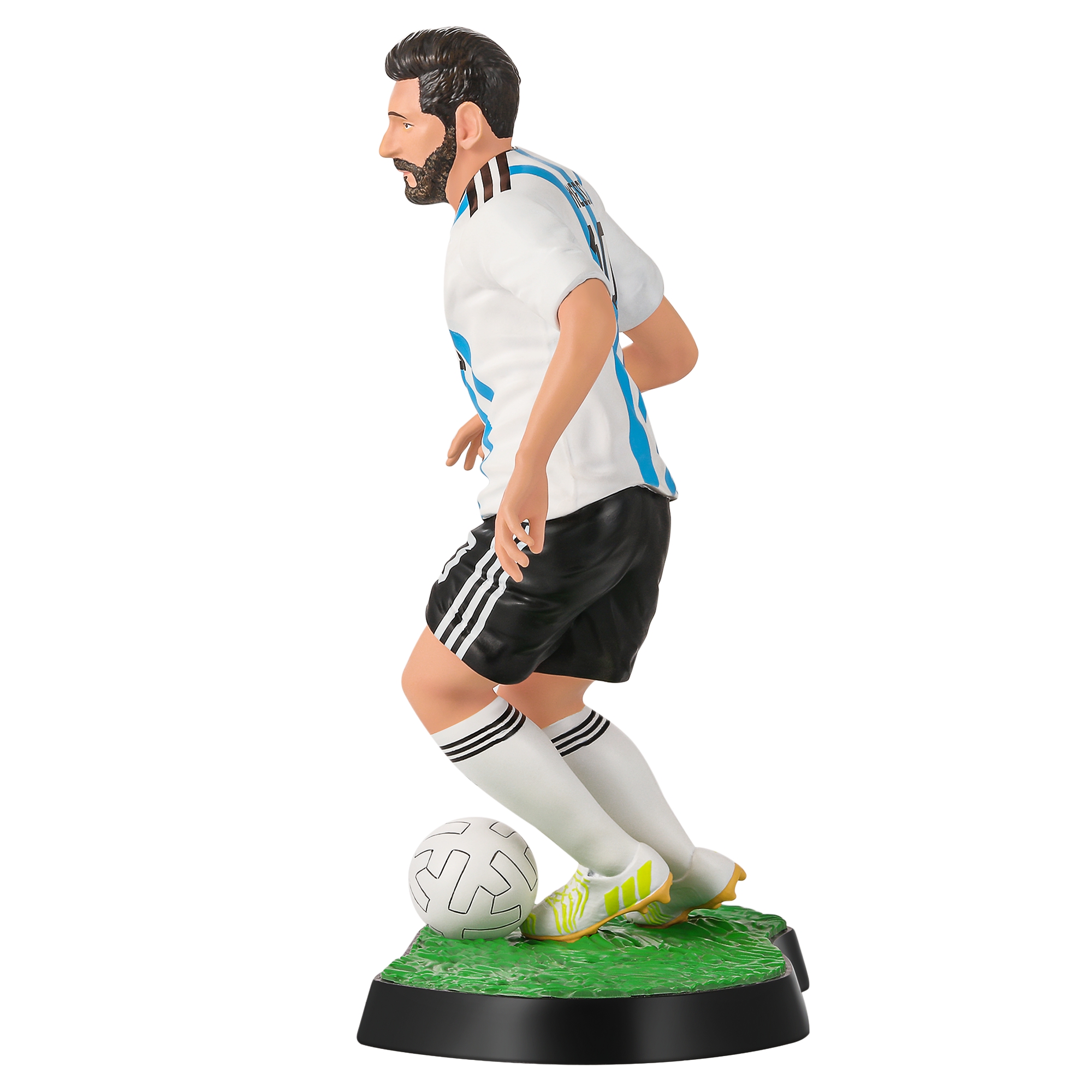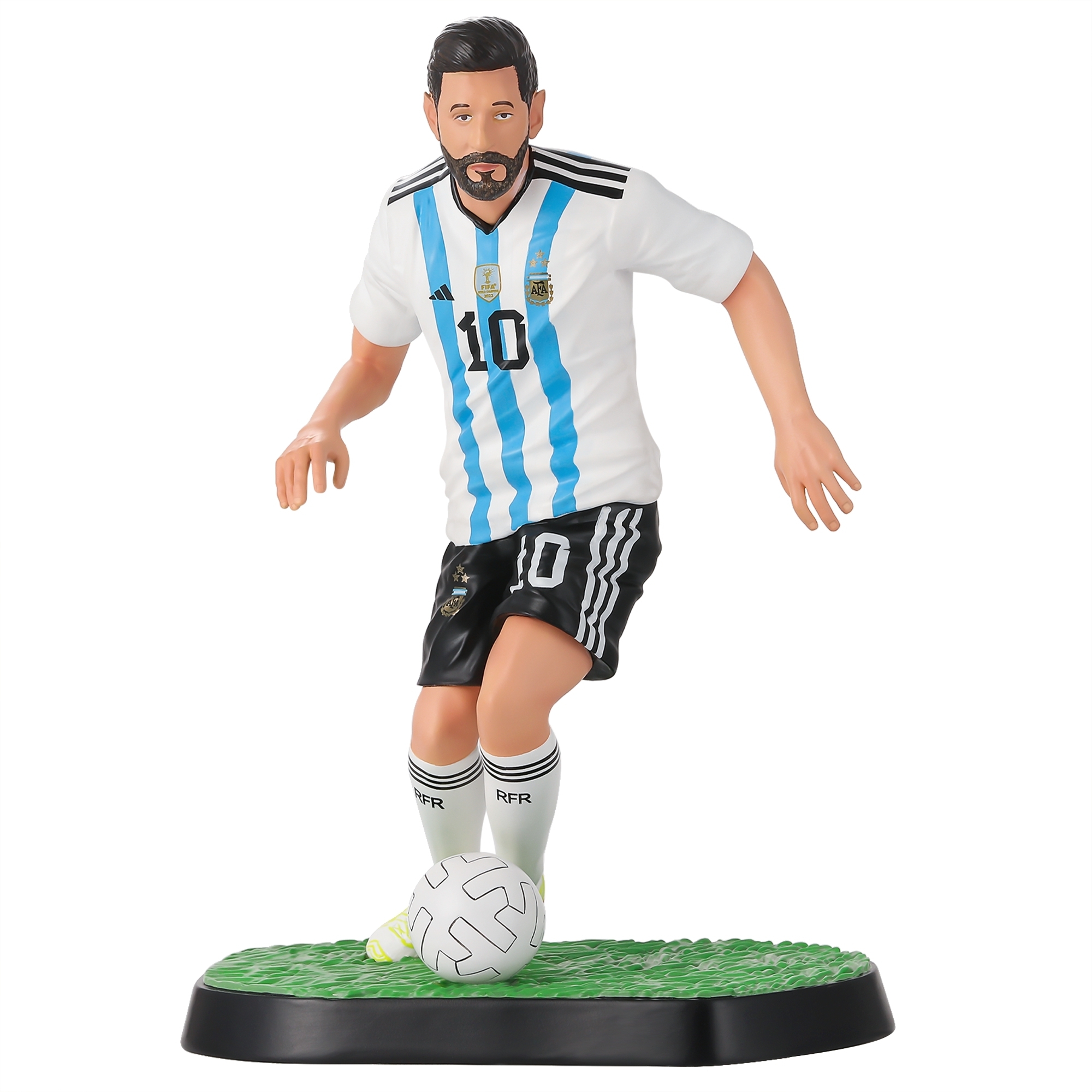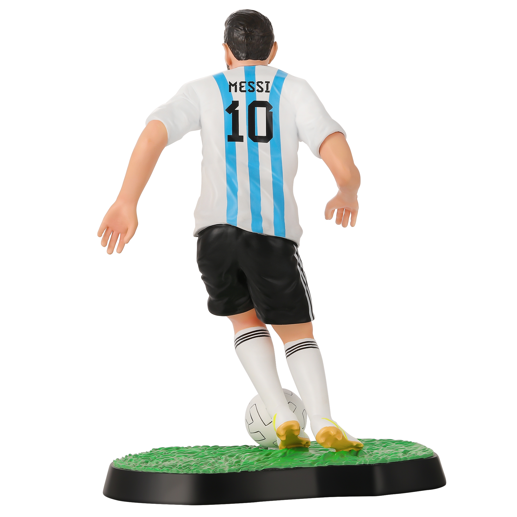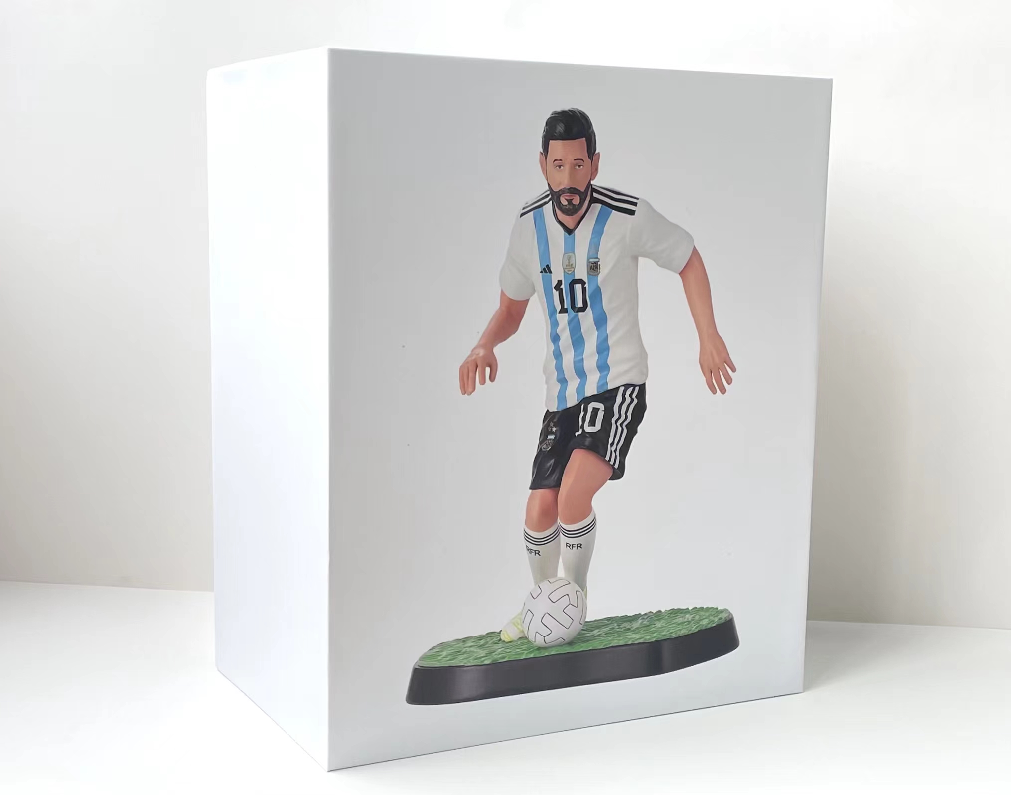 This is a Lionel Messi-themed figurine, accurately replicating his iconic look in the Argentina national team's blue and white strip. It's a popular choice for football enthusiasts, collectors, and home decor. Perfect for your gift and novelty product business.