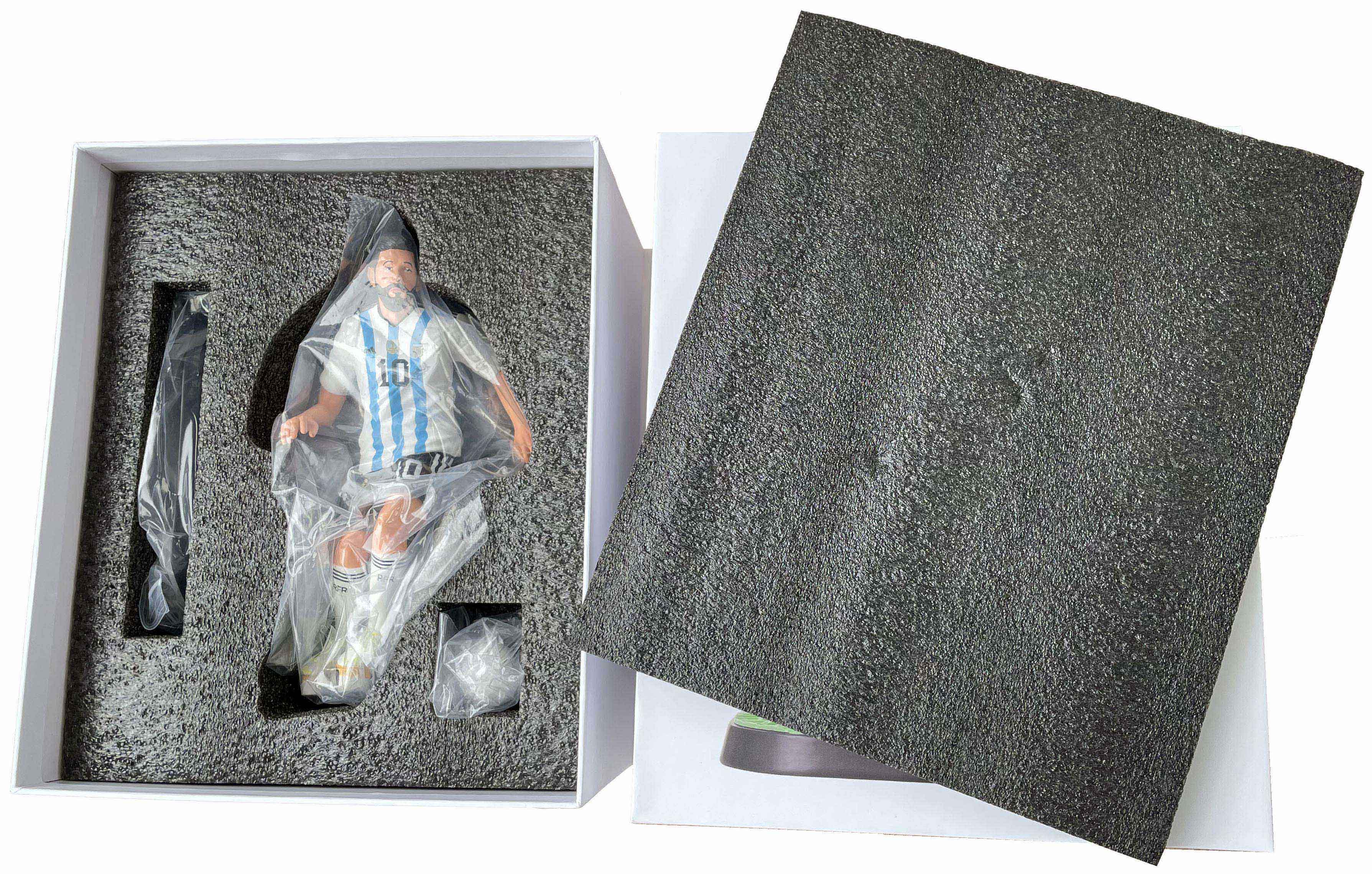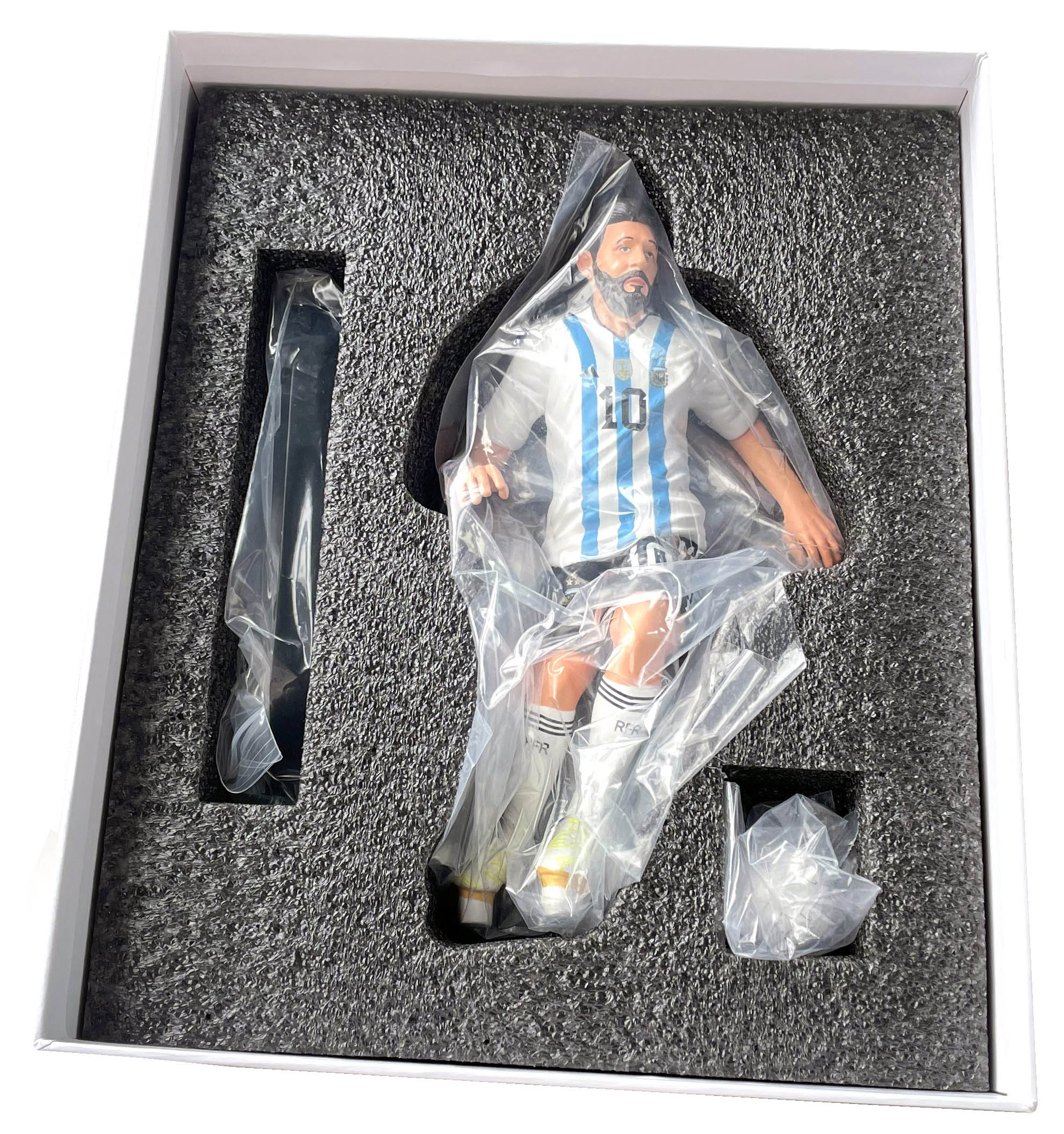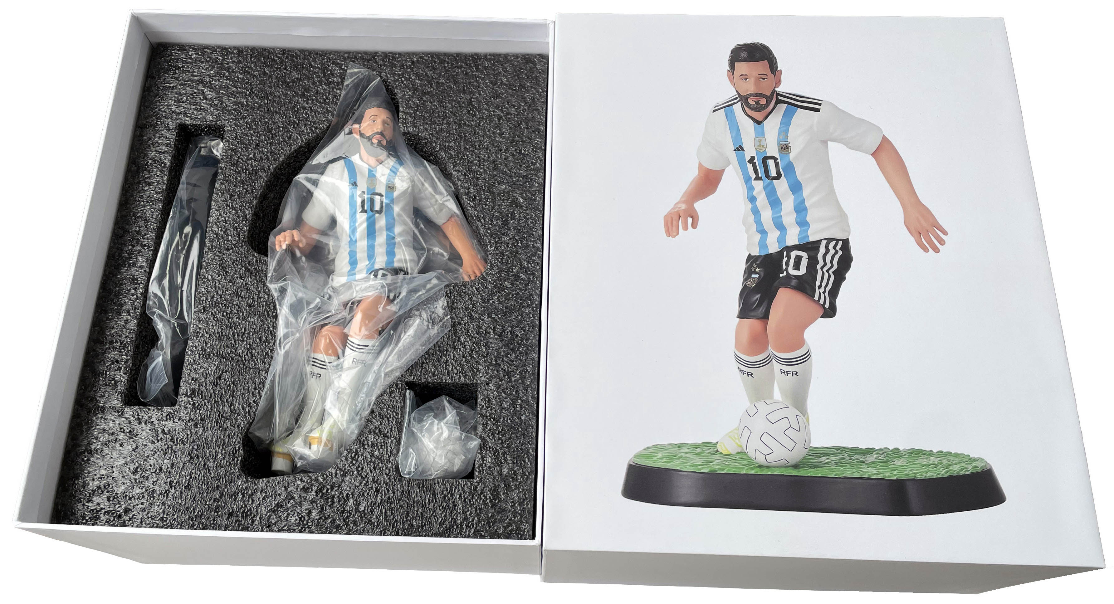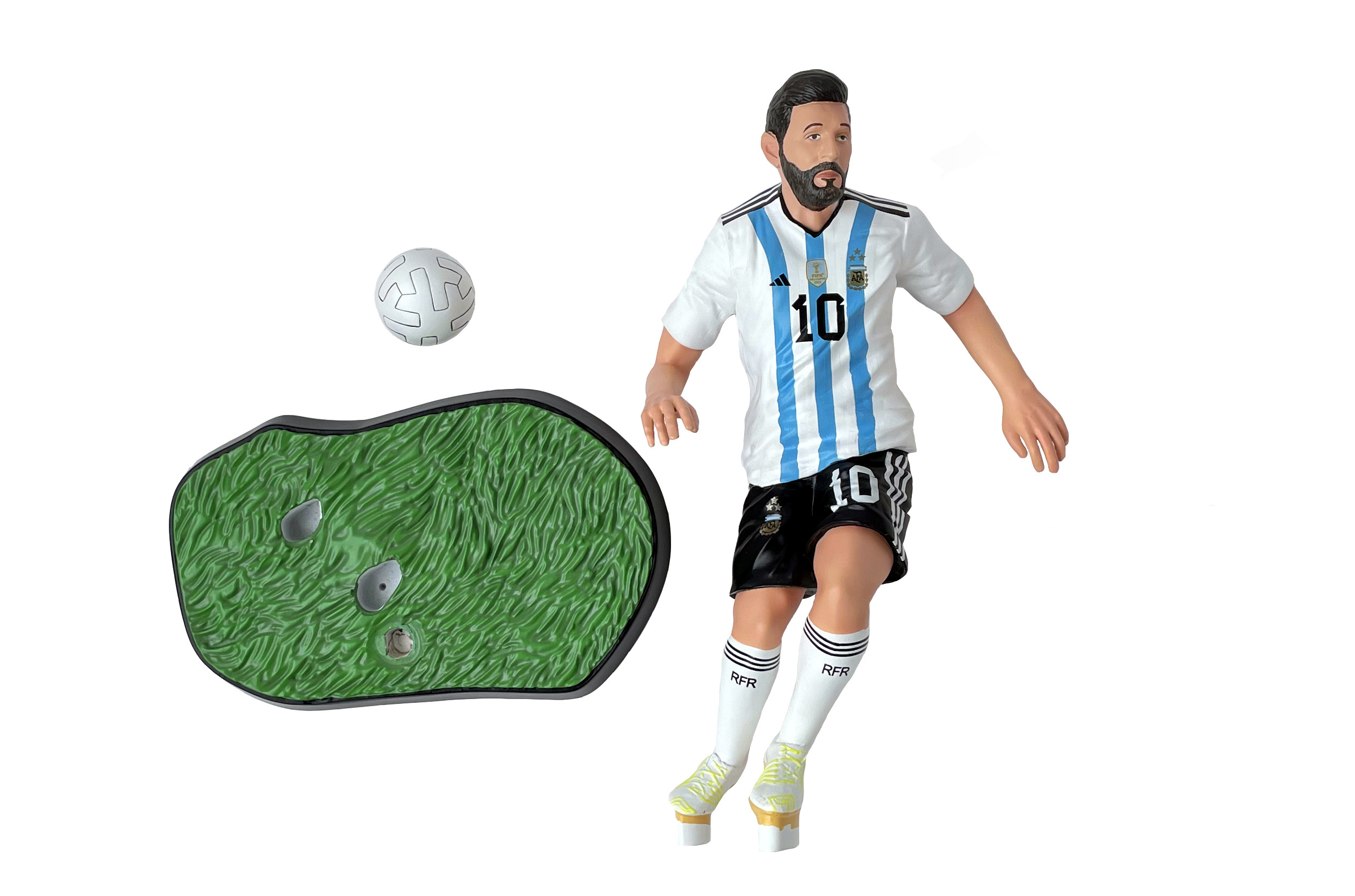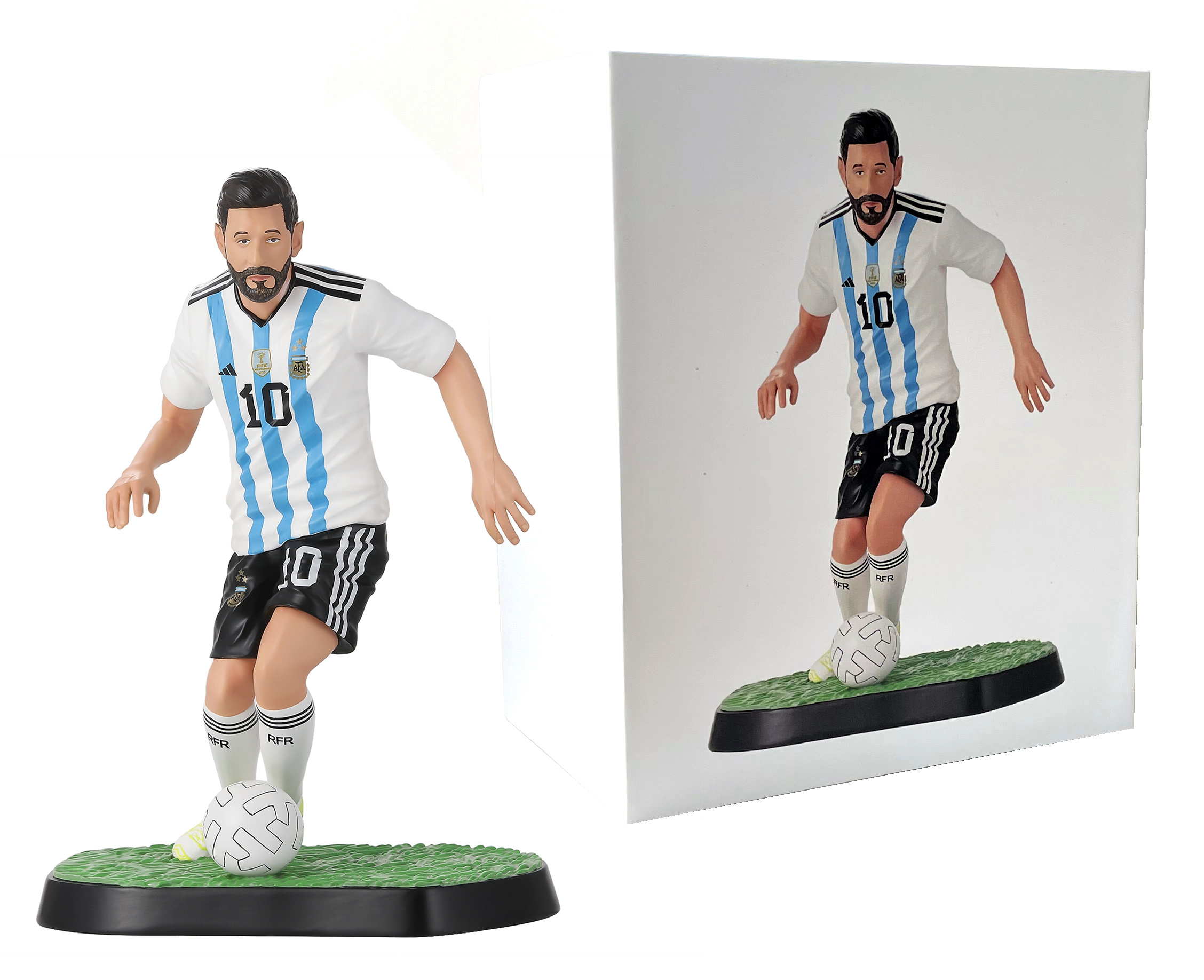 This is a Lionel Messi-themed figurine, accurately replicating his iconic look in the Argentina national team's blue and white strip. It's a popular choice for football enthusiasts, collectors, and home decor. Perfect for your gift and novelty product business.