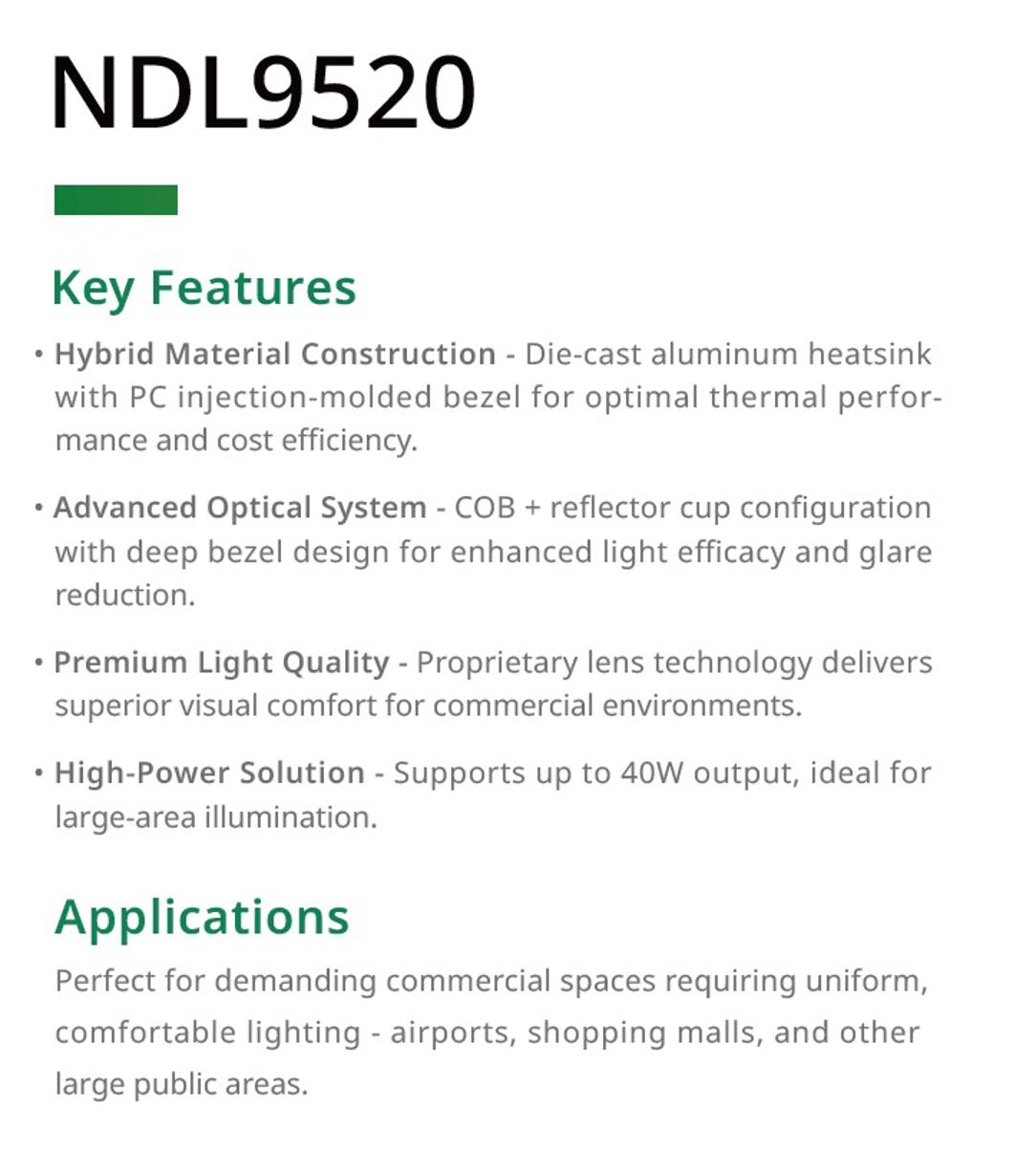 Die-cast Aluminum heatsink with PC bezel for optimal thermal and cost efficiency, COB + reflector cup configuration for light efficacy and anti-glare, proprietary lens technology, power up to 40W