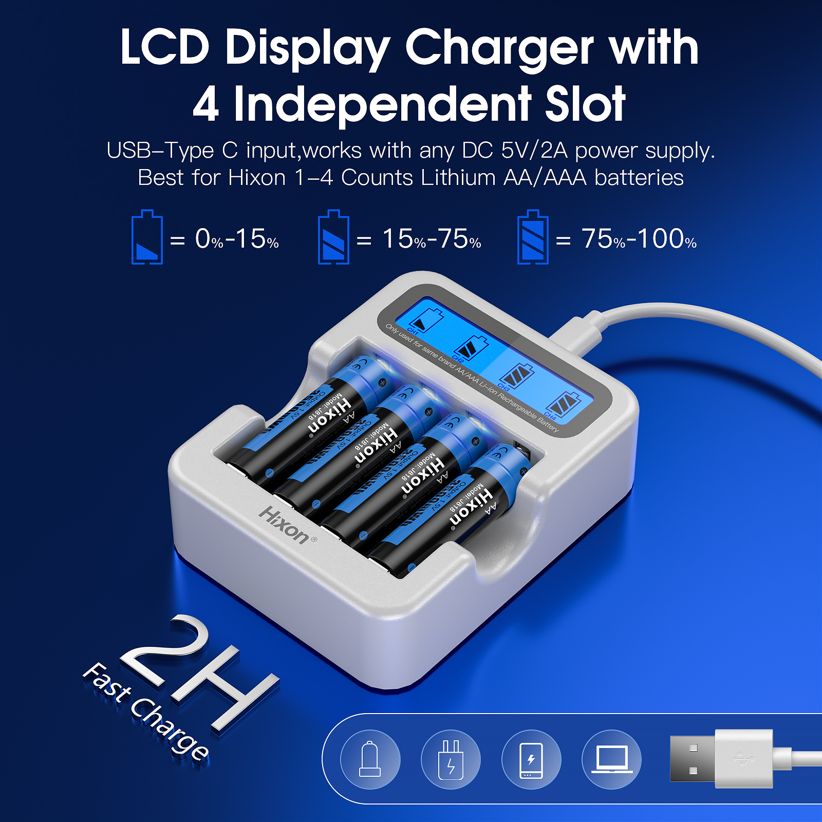 Specific LCD Display charger, 4 independent slot, can show the battery charging status.
