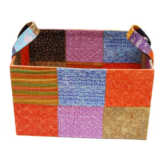 The rectangular storage box features patchwork patterns for a stylish touch. It comes with a handle on both sides for easy carrying. This box is an excellent container for sundry items.