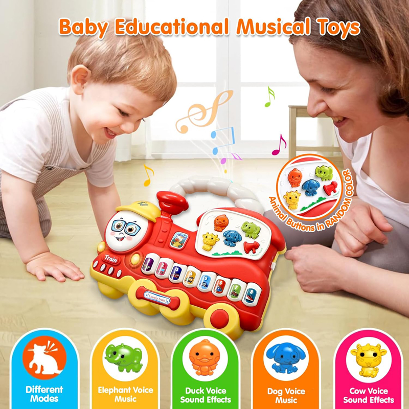 【Multifunctional Interactive Baby Piano】Red train musical piano toys for 12 months can play in 3 function modes, 8 keyboards can switch to piano&traffic sounds and soothing melodies, 4 animal buttons in RANDOM COLOR with different animal sounds and music. Perfect sensory toys for babies 6-12 months to develop hand-eye coordination and fine motor skills. 【Adjustable Volume & Easy to Carry】Don't you want a quiet space when baby playing toys! This piano keyboard toy offer an adjustable volume control to get a more comfort environment. Lightweight and portable handle design suitable for travel in car, play on high chair, hang on the stroller, put in diaper bag. Great baby toys 6 month plus for the little hand to grip and carry around. 【Safety and Reliable】The baby girl boy toys are made of BPA free & premium materials, does not contain small parts to avoid choking hazards. Smooth edges won't hurt little hands,soft light protects baby's eyes while improving visual perception. We strict comply with international safety standards, and 100% safe for your baby. 【Early Music Education Development】Designed for babies aged 6 8 10 12 months. Soft flash light, sweet music, traffic sounds, animal sounds help develop basic rhythm & musical skills, auditory skills and color recognition. Different songs and animal sounds stimulate language development, fostering imagination and creativity. 【Perfect Gifts for Toddler】Great musical piano toys 6 to 12 months, 12-18 months, ideal presents for birthday, Christmas, Easter gifts! Perfect gifts for 1 2 year old boys girls.