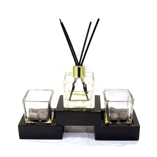 Spread the fragrance of essential oils to the air with this reed diffuser set. It comes with two glass jars and a bottle for easy viewing of the color of the oil. Wooden base offers style and elegant to the whole design.