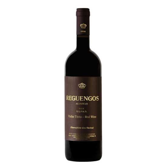 Displayed is a bottle of Garrafeira from Alentejo, Portugal. Made from a blend of high quality grapes, this red wine is full bodied with a complex structure and a long-lasting aftertaste. This high quality red wine is dry and goes well with steaks and stews.