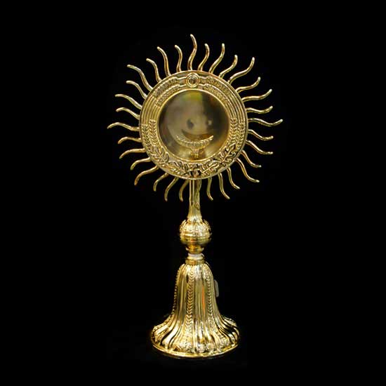 This radiant religious decoration comes in a golden hue for a luxurious touch. It features a sun-like design on the top and a sophisticated base. This alluring decoration is constructed from copper.