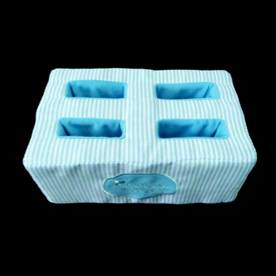 Featured here is a box-shaped holder for holding your remote control units. The remote control holder is made with quality fabric for a soft texture. The blue and white striped patterns give the holder some modern style.
