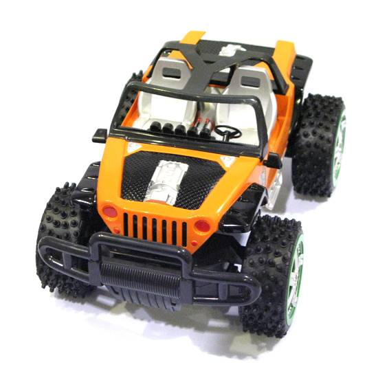 This is a remote control toy jeep. It comes with a wireless remote control, which is for commanding the car to move forward or backward and right or left. The four wheels will light up when it is moving.