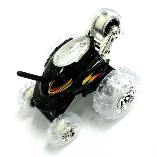 This remote control monster stunt car comes with extraordinary transparent wheels. The special body in piano black attracts people's attention immediately. There is an easy-to-handle wireless remote control included.