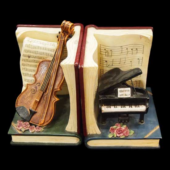 The featured set of book ends delights you with its exquisite craftsmanship. The life-like violin and piano designs offer distinction and individuality. This book end pair makes a wonderful gift idea for the music enthusiasts.