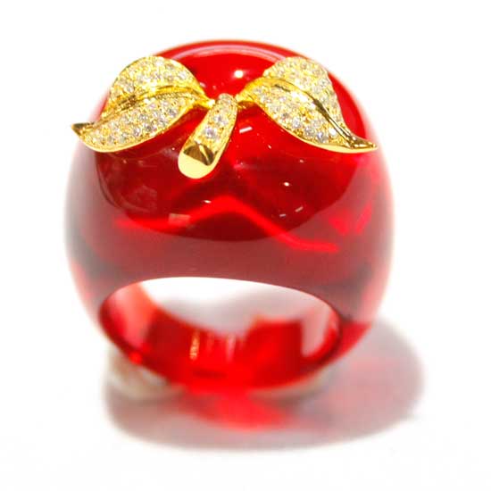 The resin ring here is designed in a cute apple shape to please girls’ eyes. The sharp red ring is adorned with golden stems and leaves. CZ stones are set on the leaves to look additionally enchanting.