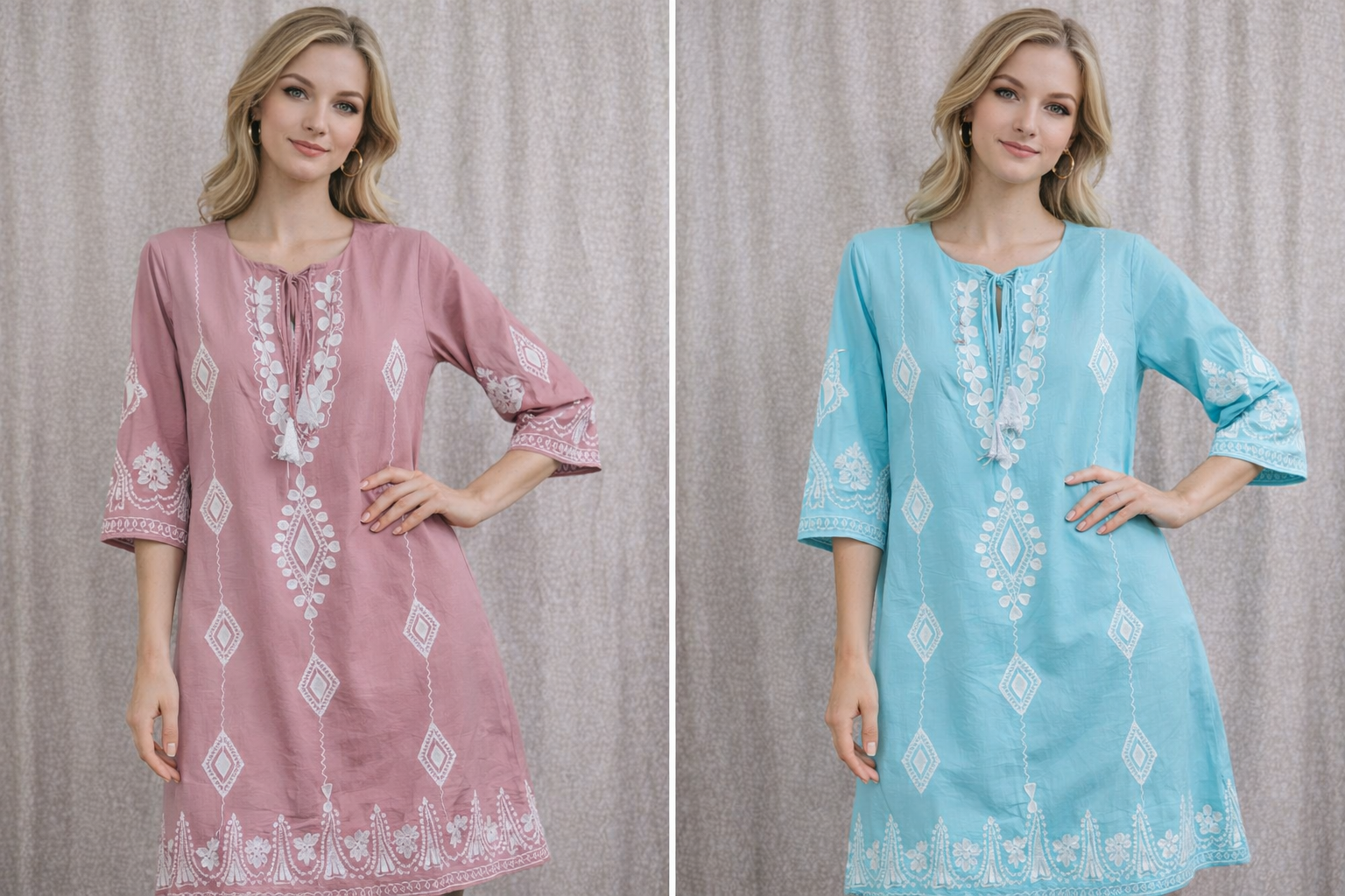 Our collection features solid colors and vibrant prints, beautifully complemented with fine embroidery work. Made from soft, airy fabrics ideal for warm weather. These garments offer effortless style for everyday wear, vacations, and beach outings. Comfort meets modern design in every piece.