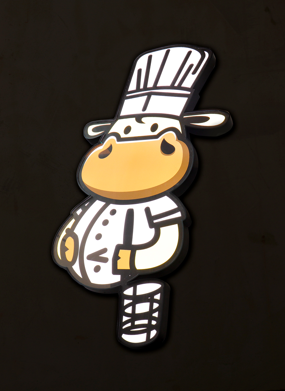 The main course of the restaurant is beef.The main image of the signboard is cartoon cattle.