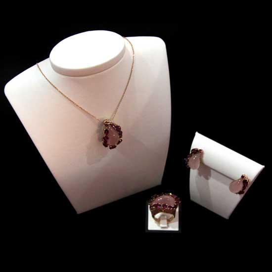 The stunning jewelry set consists of a rhodolite necklace, a ring and a pair of earrings. The charm appears in a bouquet and gives a joyous feeling. The jewelry item is also embellished with diamonds and pink sapphire stones to shine in dazzling radiance, accentuating ladies' evening dresses.