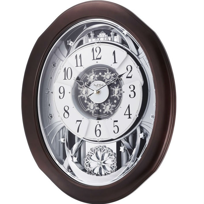 This wall clock is housed in a wooden case and flaunts a classic oval shape that complements any interior style seamlessly. The dial is set with Arabic numerals and double hands, showing off an artistic flourish with the rotating decorations in the center and surrounding. Coming with a thoughtful design, it reports time hourly with selectable melody during daytime and keeps silent at nighttime with the sensing operation.