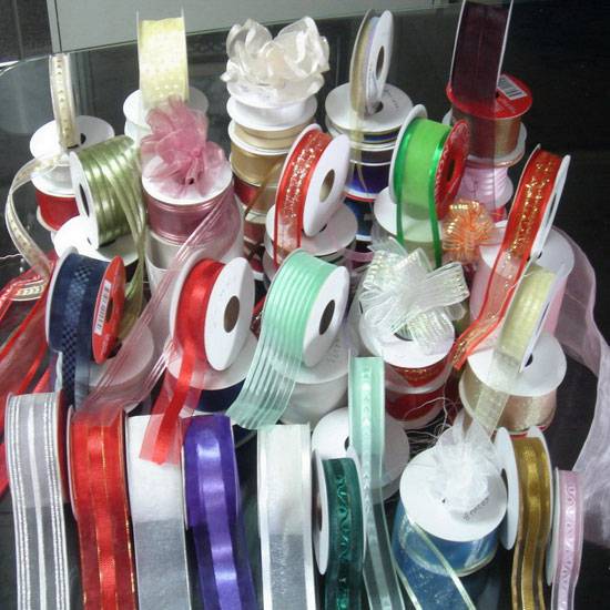 - Featured here are rolls of sheer ribbon and bows for gift wrapping or trimming purposes.