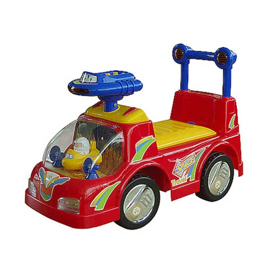 Showcased is a ride-on car coming with a space theme. Its front window encases a cute toy robot steering a plane. The kiddie car also features a thematic steering wheel for added amusement.
