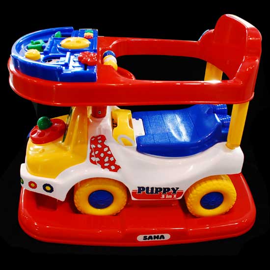 Displayed here is a ride-on car designed for six months and up. It comes with a rocker base for added flexibility. This ride-on car is characterized by the activity panel.