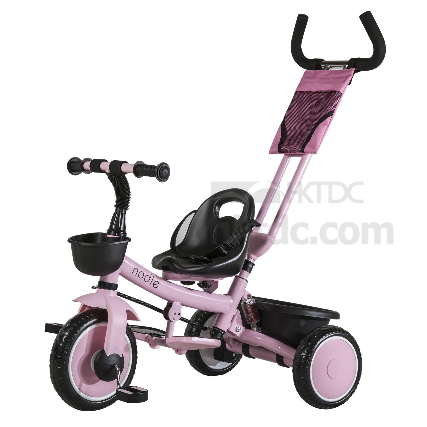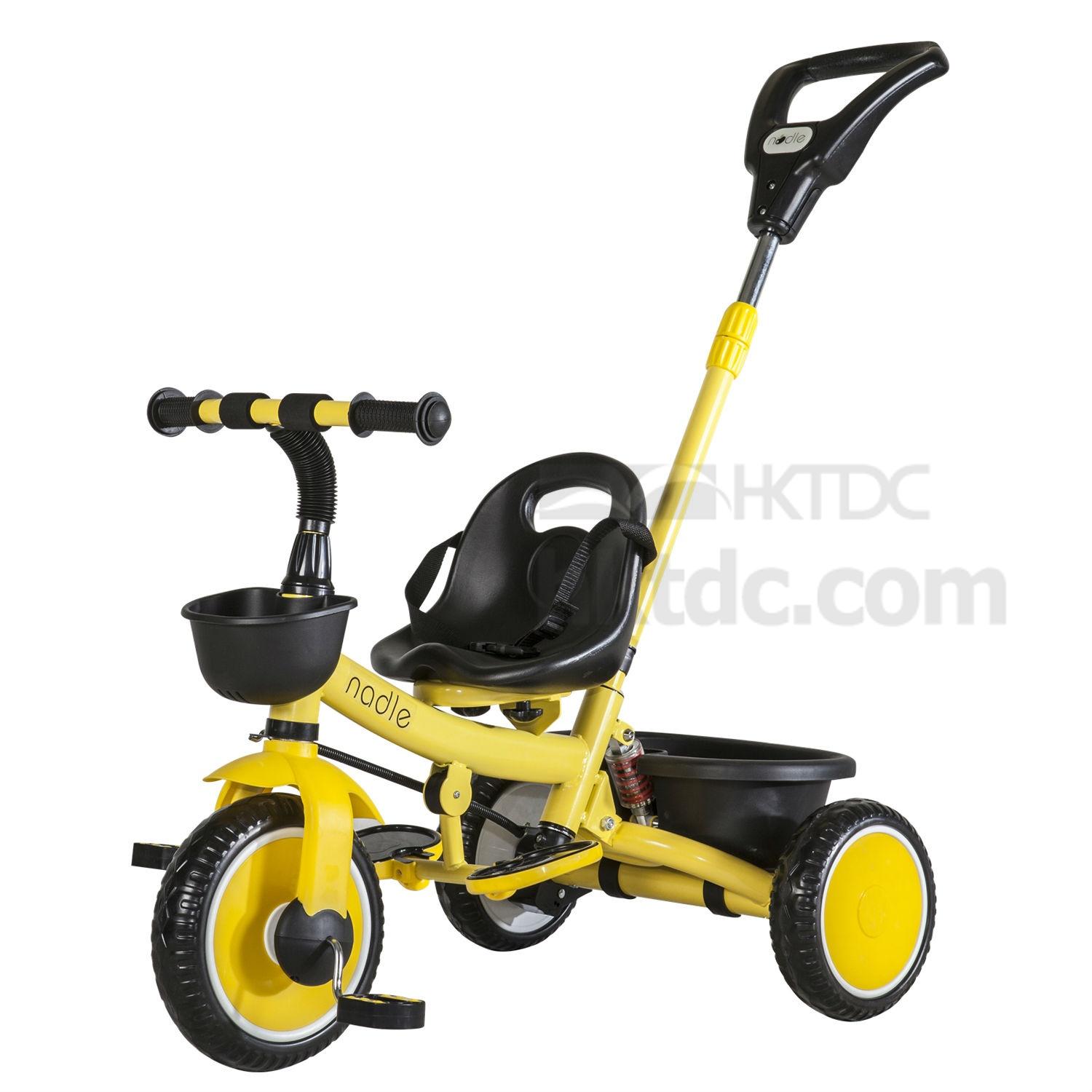 This ride on tricycle comes in a classic style and has a long handle at the back for using as a stroller. It has a durable frame made of steel pipes and is equipped with suspension system on the back wheels to absorb shock. The ride on tricycle offers a simple and comfortable cycling experience and is excellent as a gift for young children.