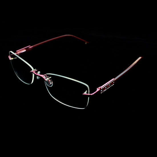 Showcased is a pair of rimless glasses with acetate temples. The Swarovski accents offer added glamor and beauty. The rubber nose pads ensure comfortable wearing for long hours.