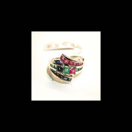 4-prong emeralds, red and blue sapphires are mounted in tension set